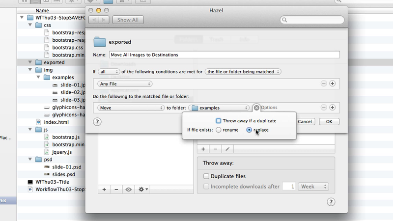 Hazel is actually my first choice for any automated file manipulations. It’s a Mac app that monitors a given set of folders and does stuff based on a set of rules. There’s also a similar free Windows app called Belvedere. Hazel has a huge following, and is literally the difference between a clutterred and a clean Mac. I use it to clean up my Downloads, Desktop and Trash folders and to highlight the apps I haven’t used for a while.