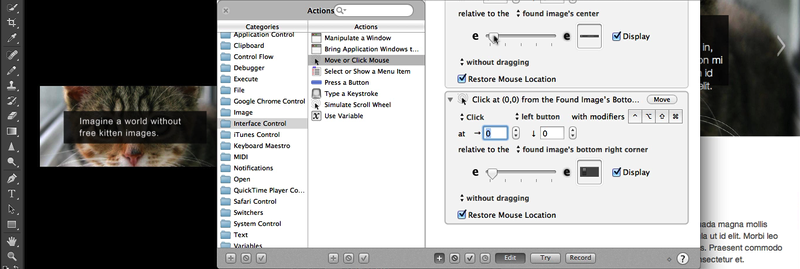 (This part is going to be Mac-only. On Windows, there’s Sikuli that can do all these tricks, but it’s not nearly as user-friendly, and there are some crazily expensive tools for automated testing, but I haven’t been able to find a good solution for a regular user. Let me know in the comments if you know any.)