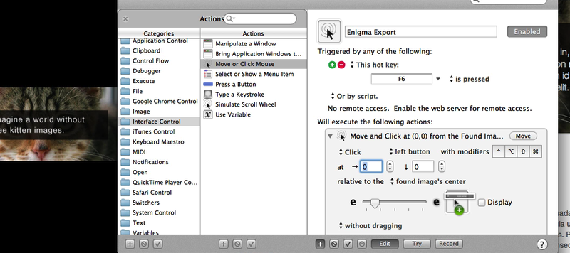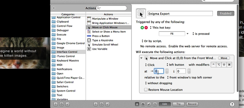 Create a new macro called e.g. “Enigma Export”, assign a hot key like F6, and add a new “Move or Click Mouse” action from the “Interface Control” section: